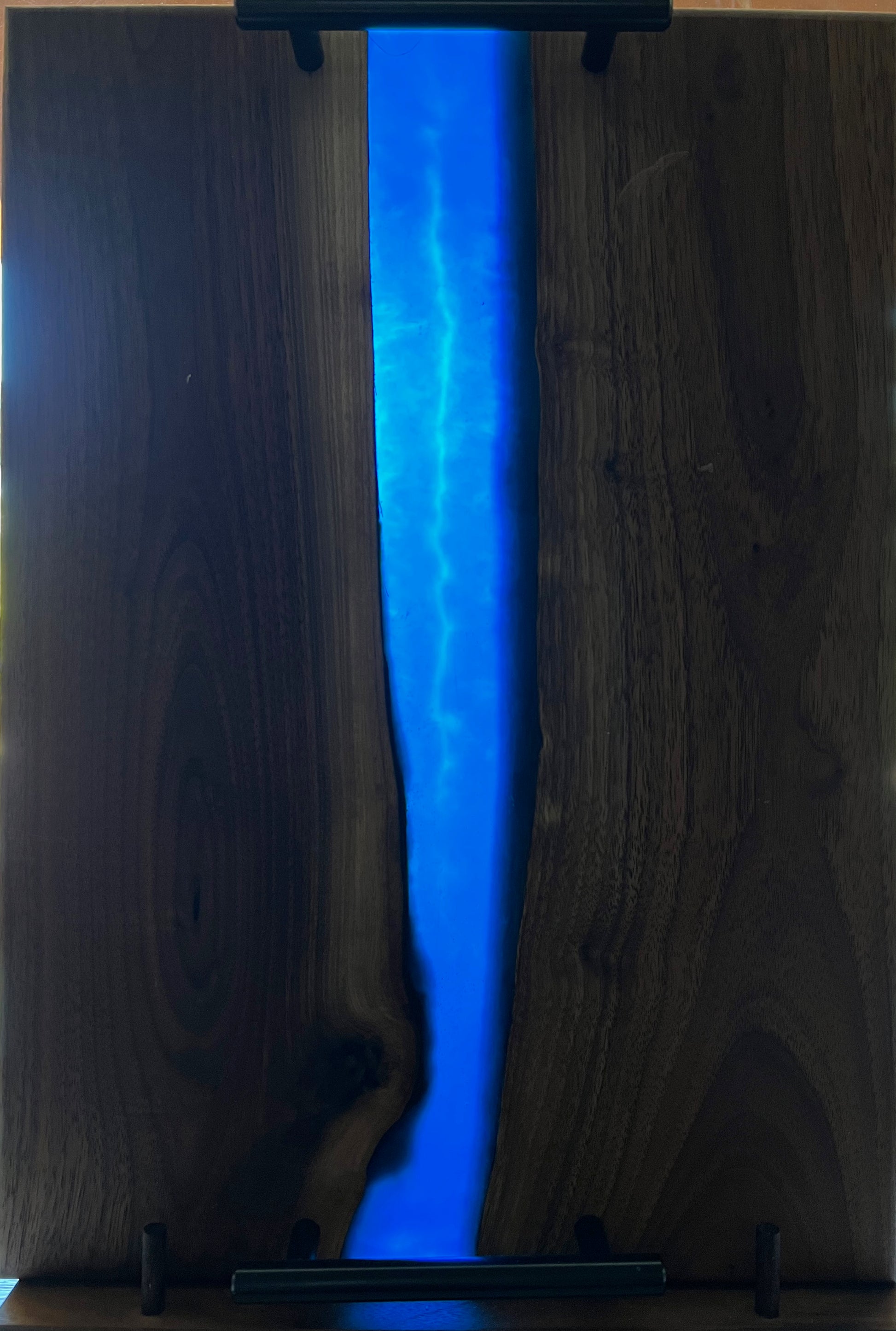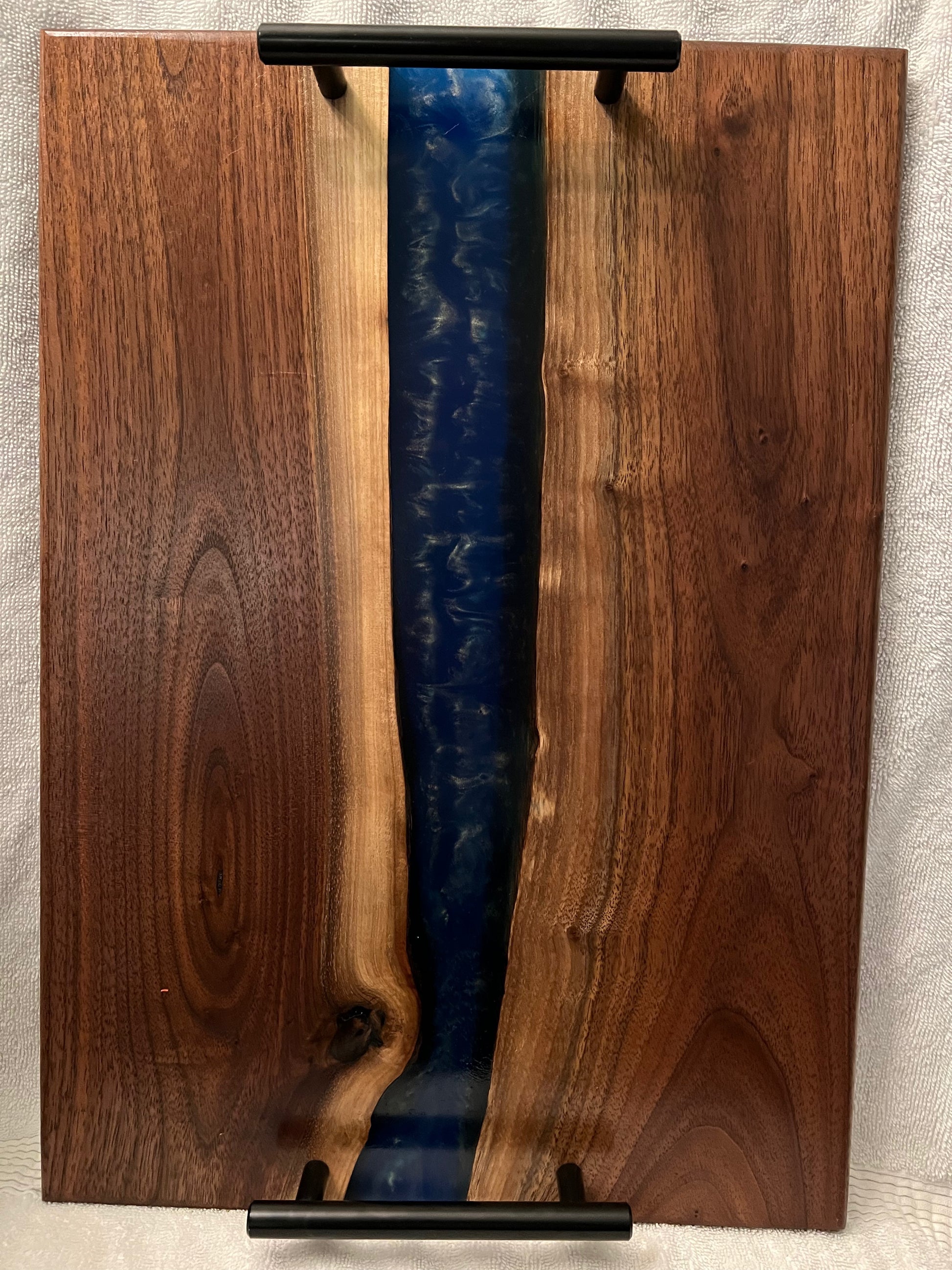 A natural piece of light walnut wood is divided by a deep blue resin river running through the middle. The beauty of this board is sure to encourage a counter display when not in use. Polished black handles allow the board to move easily from counter to table without touching the food.