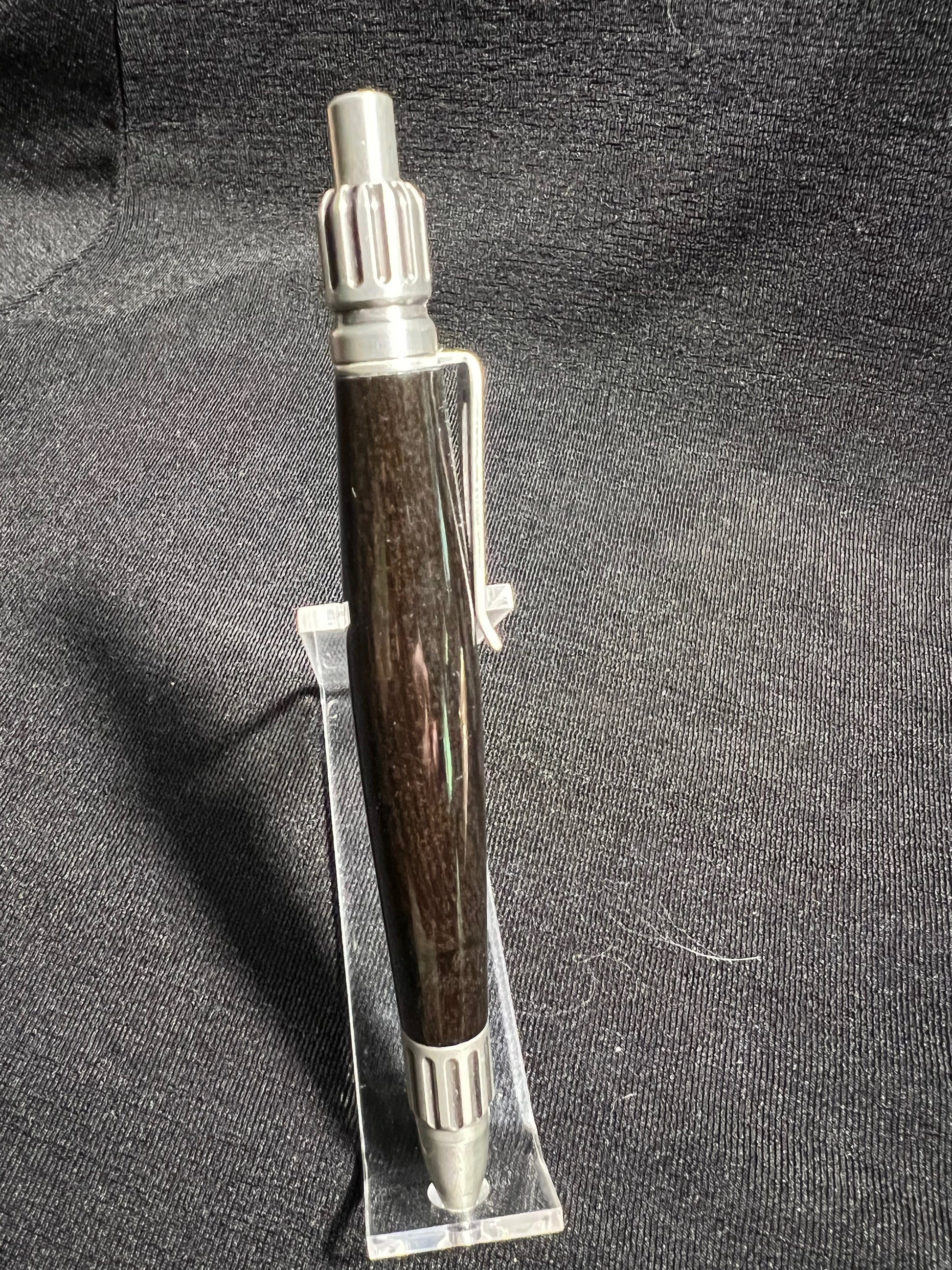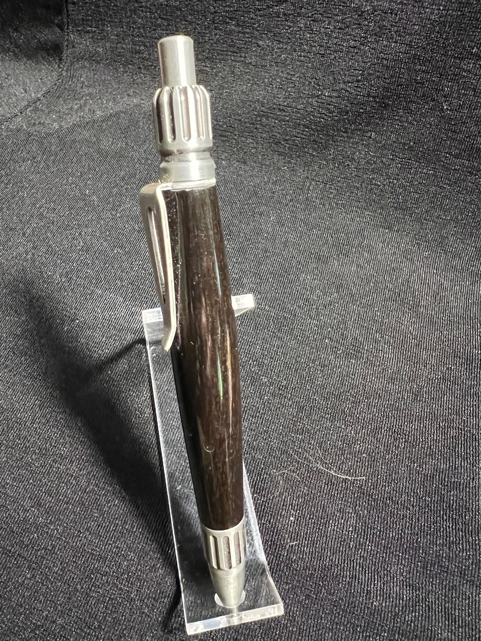 A durable click pen with the warmth and natural beauty of Ebony wood complemented with stainless steel mechanism. Hand turned to a desired shape and sanded to 600 grit, then sealed and sanded again to 3200 grit the body is finally finished with a 6-step polishing. The pride in our craftsmanship will make this a wonderful gift.