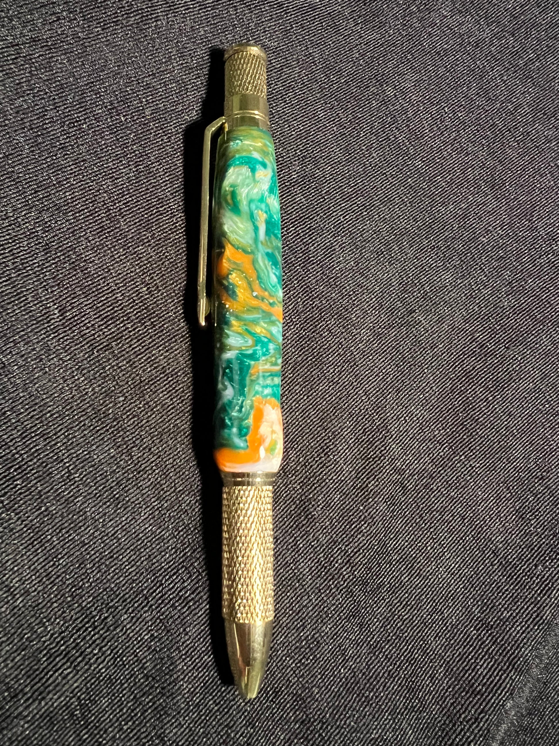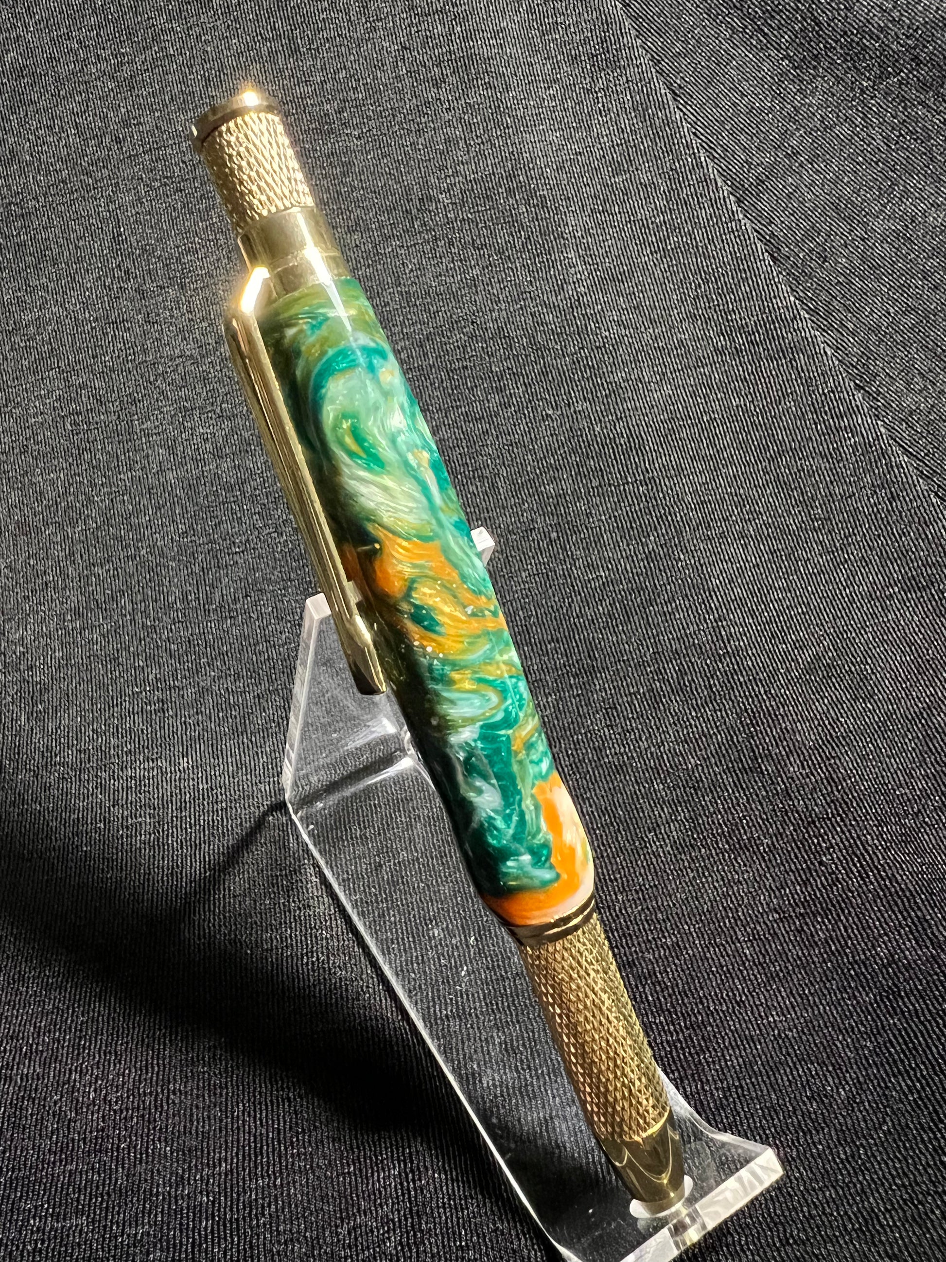 The polished acrylic body offers a mesmerizing swirl of greens and oranges.